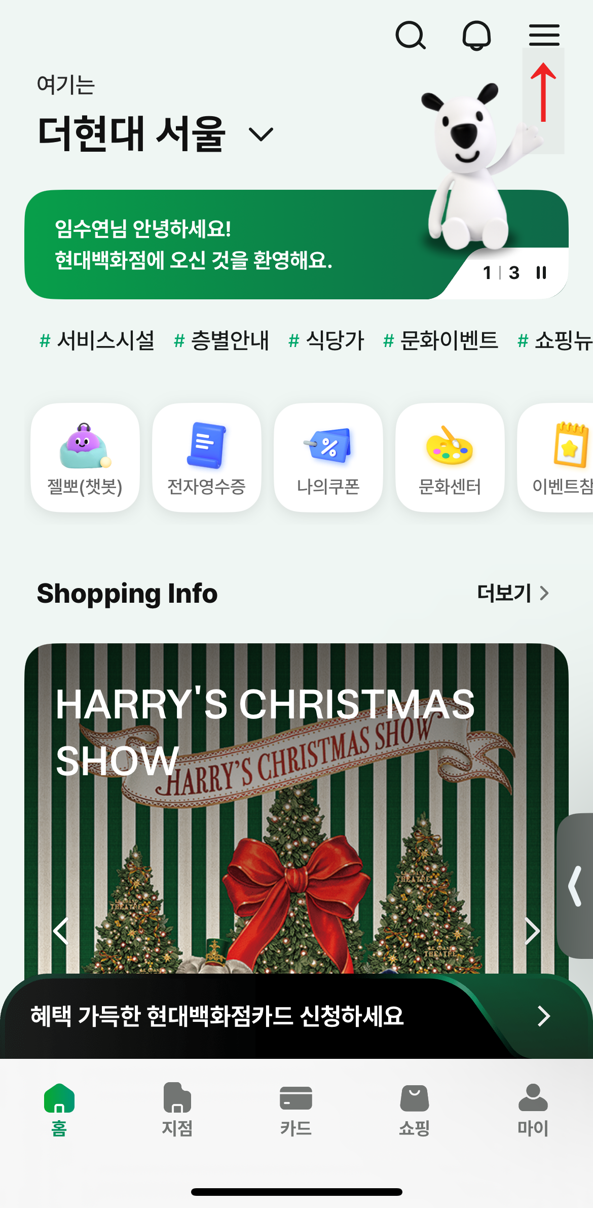 그리고 더현대 내부를 돌아다니는 빨간 곰도 만날 수 있었어요. 우리 아들은 처음에는 무서워하다가 사랑해요 포옹 10번 하고 헤어졌습니다