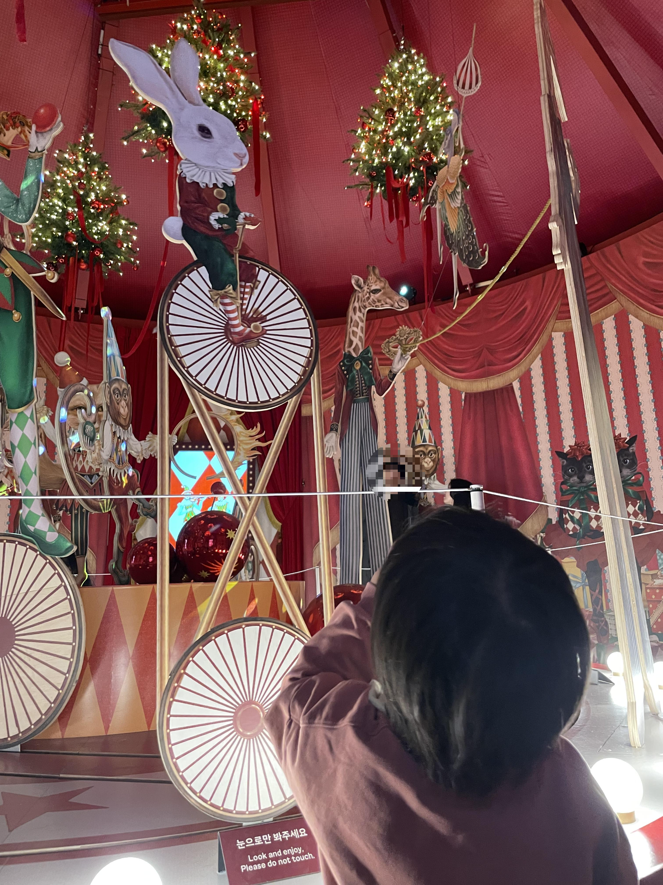 8시가 되어서 드디어 더현대 크리스마스 전시 '르 그랜드 시어터'에 입장했어요. 7시 이후에 현장 웨이팅 등록한 사람들은 한꺼번에 모두 입장시켜 주는 것 같았어요. 내부에 들어가니 도착했던 시간보다 사람들도 없고 포토스폿 대기 줄도 거의 없는 상태! 다만 유명한 목마 사진은 그 시간에도 대기가 30분에서 1시간 걸린다고 안내받아서 포기했습니다. 그래도 그 외에는 전부 둘러보았고 다 보는데 30분 정도밖에 안 걸렸어요.