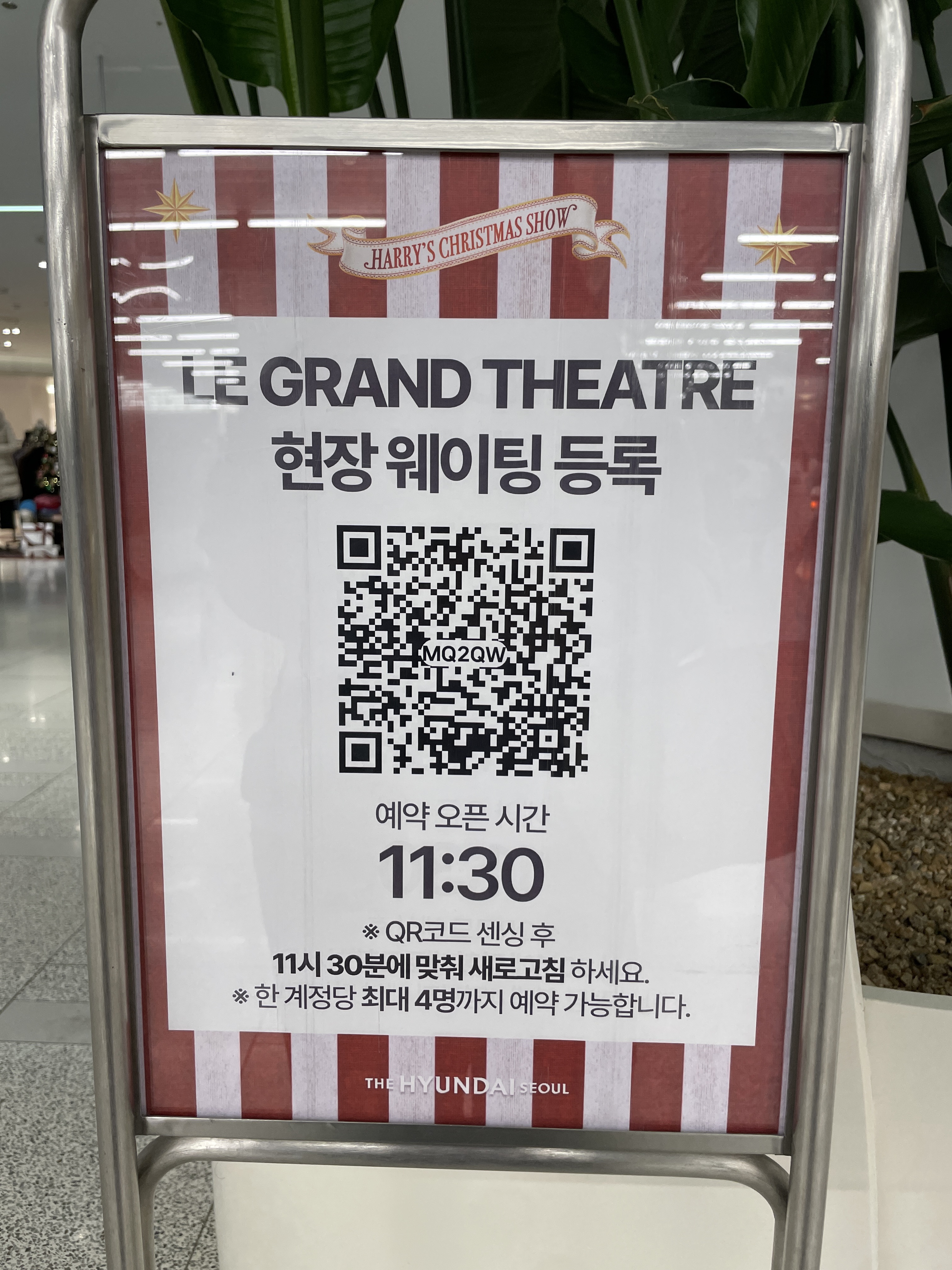 백화점 오픈이 10시지만 현장 웨이팅 자체는 11시 30분부터 할 수 있어서 오픈런을 해도 의미가 없지만, 더현대 크리스마스 현장 웨이팅 등록이 시작하는 11시 30분이 되자마자 등록을 하면 보통 30분 안에 입장할 수 있습니다. 저는 그렇게 이미 2번 다녀왔습니다.