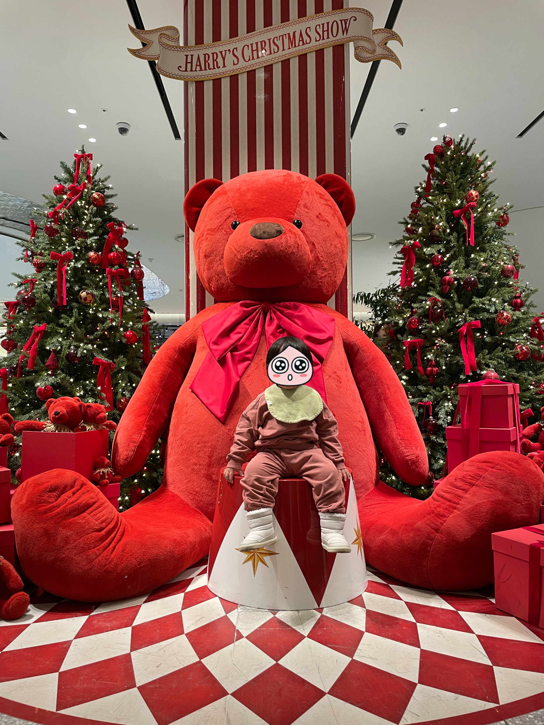 그 외에도 더현대에는 23개월 우리 아들이랑 구경할 곳이 많았어요. 곳곳에 트리가 전시되어 있었고 해리상점 시그니쳐 빨간 테디베어와 사진을 찍을 수 있는 포토존도 있었어요.