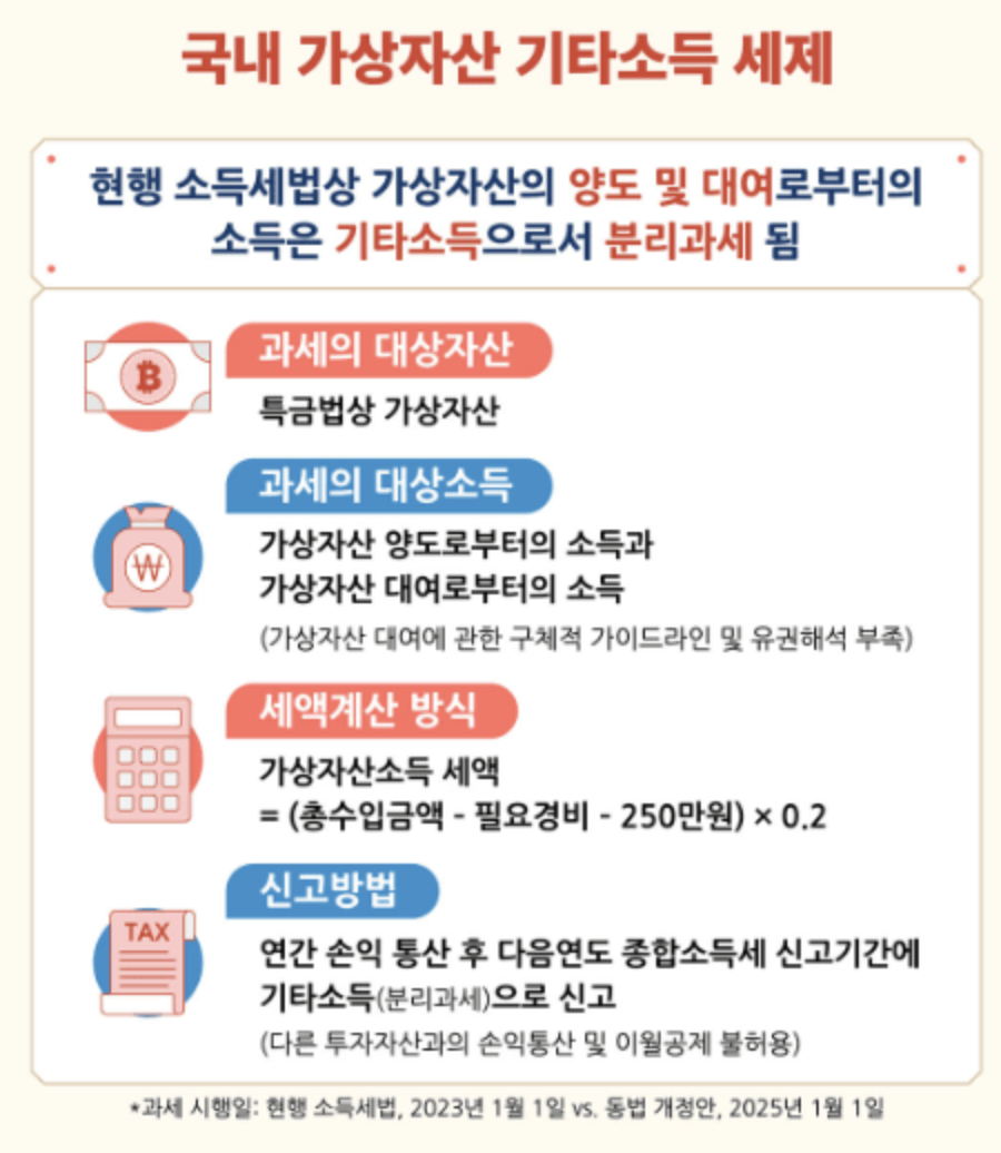 가상자산이란 디지털 형태로 존재하며, 거래를 통해 가치를 인정받는 자산을 의미합니다. 블록체인 기술을 기반으로 하여 비트코인, 이더리움, 리플과 같은 다양한 암호화폐가 이에 해당합니다. 최근 몇 년간 가상자산의 인기가 높아짐에 따라 각국에서는 이를 어떻게 과세할 것인지에 대한 정책을 마련하고 있습니다. 우리나라의 경우, 가상자산에서 발생하는 소득은 '기타소득'으로 분류되어 과세됩니다. 즉, 가상자산을 통해 얻은 이익은 연간 소득으로 보고되며, 이에 따라 세금이 부과되는 구조입니다. 2025년 1월 1일부터는 가상자산에 대한 과세가 본격적으로 시행될 예정이였으나 2027년 1월 1일로 연기 했습니다. 연기 사유는 정부와 시행기간 사이에서 운영을 위한 지침과 구축 기반을 다질 시간을 추가로 확보하기 위해서라고 합니다. 하지만 한국에서는 2025년 하반기부터는 국경 간 가상자산 거래를 규제할 계획이라고 발표했습니다.